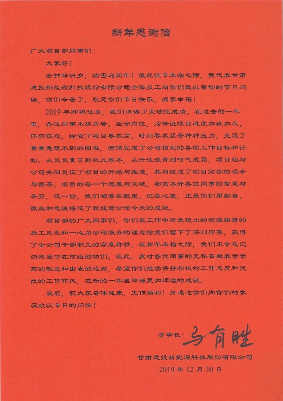 金鐘辭舊歲,瑞雪迎新年!值此佳節(jié)來臨之際,我代表甘肅建投新能源科技股份有限公司全體員工向你們致以親切的節(jié)日問候,你們辛苦了,祝愿你們節(jié)日快樂,闔家幸福!