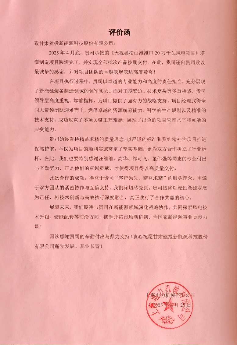 近日,甘肅建投新能源公司收到上海電力機(jī)械有限公司發(fā)來的評價函,對新能源公司在承建生產(chǎn)上海電建天祝松山灘灘口20萬千瓦風(fēng)電項(xiàng)目過程中的卓越表現(xiàn)給予高度評價!