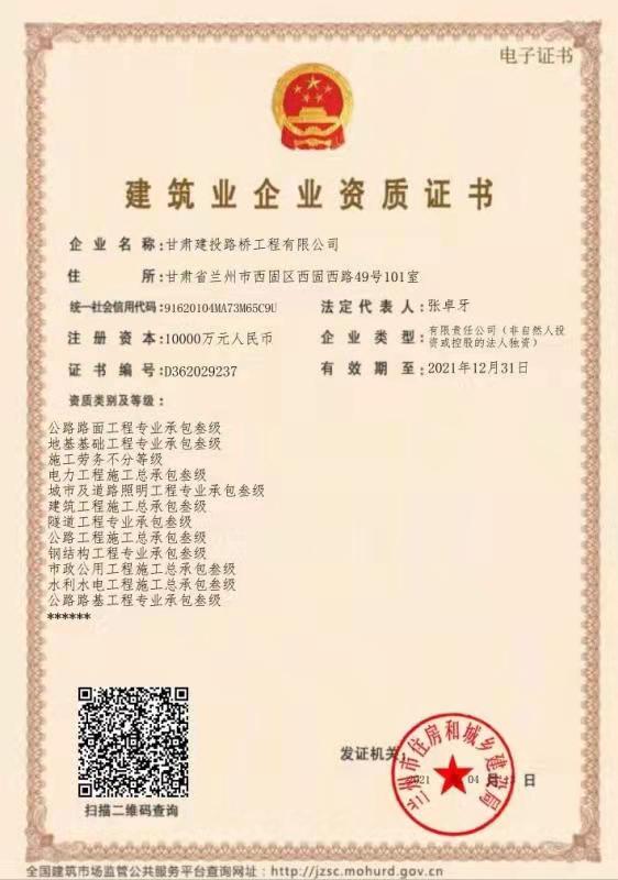建筑業(yè)企業(yè)資質(zhì)證書(公路路面工程專業(yè)承包叁級、地基基礎(chǔ)工程專業(yè)承包叁級、施工勞務(wù)不分等級、電力工程施工總承包叁級、城市及道路照明工程專業(yè)承包叁級、建筑工程施工總承包叁級、隧道工程專業(yè)承包叁級、公路工程施工總承包叁級、鋼結(jié)構(gòu)工程專業(yè)承包叁級、市政公用工程施工總承包叁級、水利水電工程施工總承包叁級、公路路基工程專業(yè)承包叁級))
